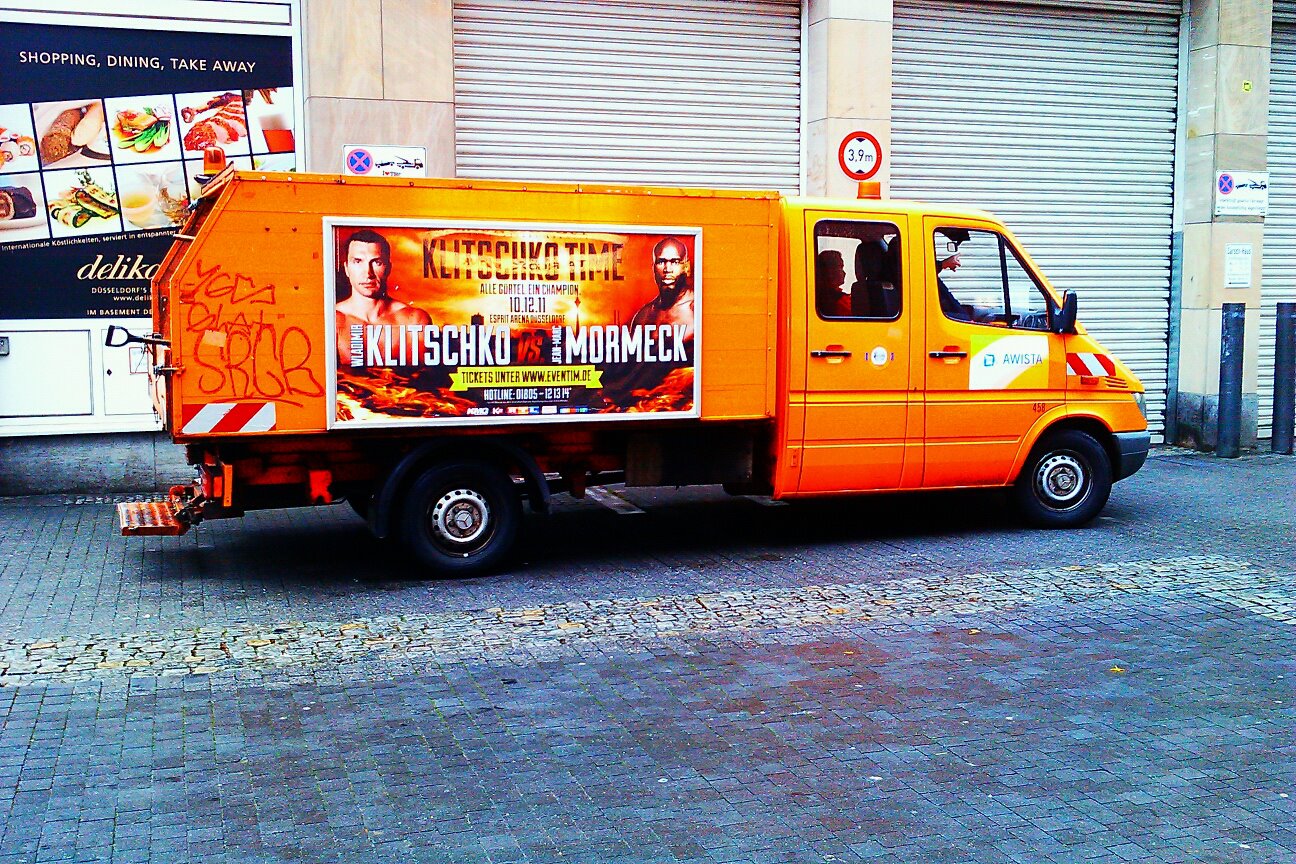 Für den Kampf Wladimir Klitschko vs Mormeck würde diese Kampfpaarung als unintressant bei viele Boxkenner bewertet. Nach dem Kampf wussten alle Bescheid das er wohl auch dahingehörte wo dieses autenthisches Bild mit Werbung auf den Müllwagen in Düsseldorf zu finden war.