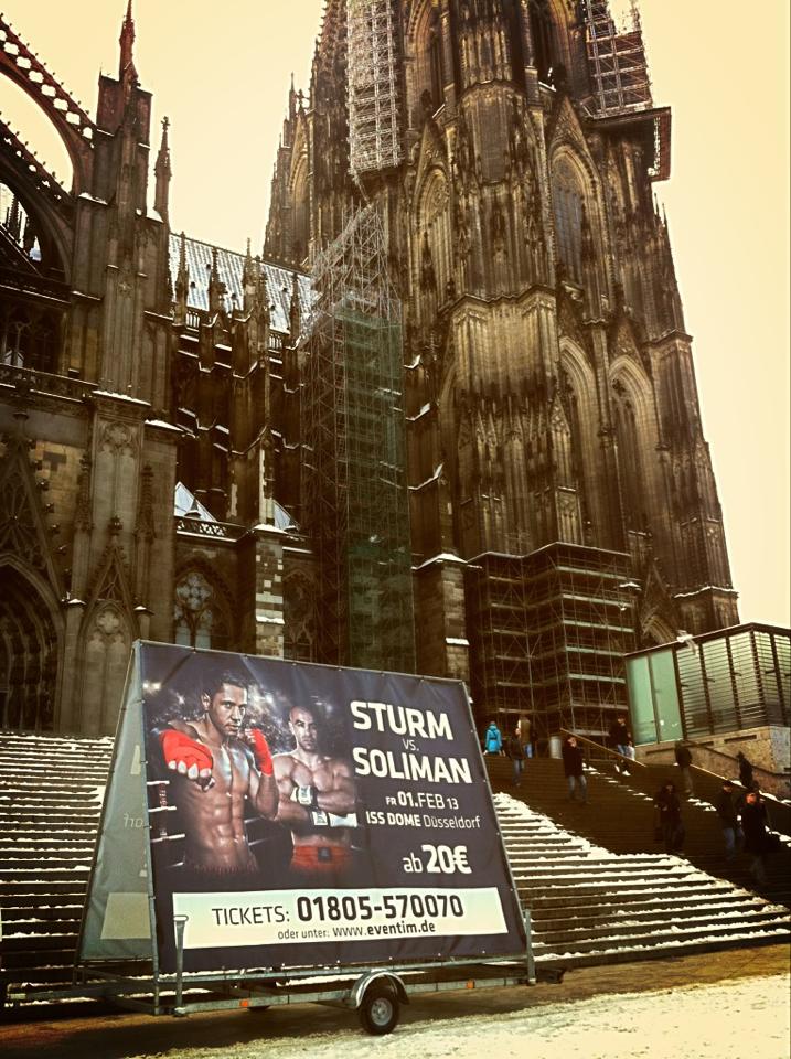 Für das Event in ISS Dome Düsseldorf traut sich sogar Sturm Box Promotion das Plakat am Kölner Dom zu stellen.